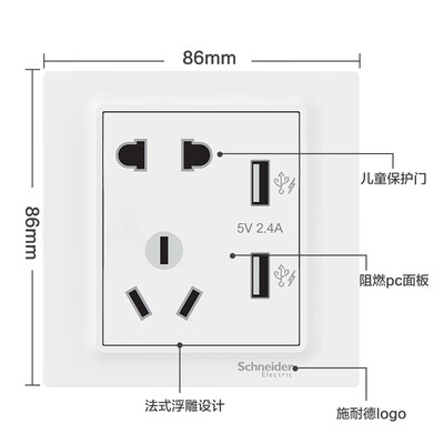 商品名称:施耐德电气A3J42610U2_WE_C1; 商品编号:100004041925; 商品毛重:100.00g; 商品产地:中国大陆; 类别:插座; 插座类型:墙面插座; 插孔类型:五孔,USB孔;