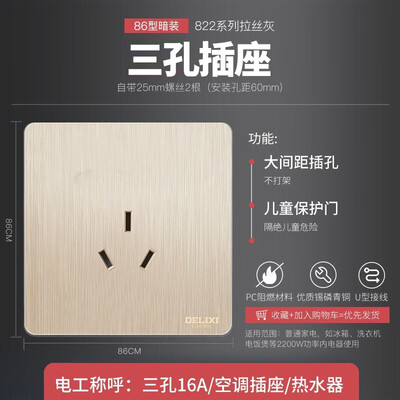 德力西822系列三孔插座EE86S16C开关快递很给力,包装结实,完整无损,质量非常的好,独立塑封装,香槟@泽亮丽,凸显高贵,做工精细,跟我家的装修风格非常搭调,孔间距挺宽的,二3J可同时插入,插拔很顺畅,是正品,质量有保障,好质量就该顶一个,值得推荐!下次再来买哦。德力西822系列三孔插座EE86S16C宝贝收到,物流很快,描述相符,比较满意,好评,推荐是正品,而且价格不贵,用着也很大气,一直在用,很好?值得购买的产品,做工非常精细,比想象中的好,推荐大家尝试特别特别特别好,没有任何破损的地方,外观也好看,好评!白色超级白。才干净很好看,亮面材质,四周没有棱角不会伤到小孩。16a插口拔插很稳。质地厚,用电动工具反复拧没有开裂,没有变形。五金件螺丝也一样,不会变形。快递送货及时有礼貌。当天下单当天到货给力。