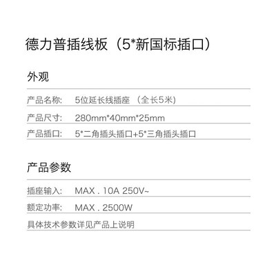 商品名称:德力普DLP-C1150; 商品编号:100007351449; 商品毛重:0.625kg; 商品产地:中国大陆; Type-c接口数量:不支持Type-c接口; Type-c功率:其他; 插孔数量:5孔; 额定功率:2500W; 全长:3.1米-5米; 插孔电流:10A; 适用标准:国标; 开关方式:总控; USB接口数量:不支持USB接口; USB电流:无USB接口; 款式:插线板;