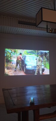 试了好几天才来评价,店家服务很好,东西非常满意,图一白天投影效果,图二图三都是窗帘拉起来投的,前两图是用金属幕布投的,图三投的白墙,你们自己比较哦!J9音响效果非常不错,就音量和我预想有点点距离,不过在商品房里够用了!我买的是金属幕布感觉没有白墙亮不过金属幕布白天比白墙好用