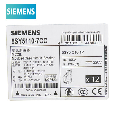 商品名称:西门子5SY5110-7CC(DC C10 1P); 商品编号:100011514906; 商品毛重:160.00g; 商品产地:中国大陆; 货号:5SY51107CC; 分断能力:其他; 额定电流:10A; 极数:1P; 类型:微型断路器;