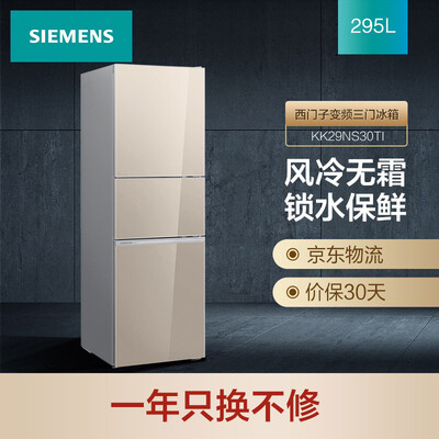 品牌:; 商品名称:西门子BCD-295W(KK29NS30TI); 商品编号:100007980075; 商品毛重:82.0kg; 商品产地:中国大陆; 系列:其他; 压缩机:变频(节能); 类型:常规独立式冰箱; 门款式:三门; 面板材质:钢化玻璃; 面板颜色:金色; 制冷方式:风冷(无霜); 宽度:65.1-70cm; 总容积:251-300L; 高度:180.1-190cm; 控温方式:电脑控温; 能效等级:二级能效; 深度:60.1-65cm;