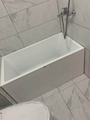 房子装修设计的时候就要求设计师一定要加上1.5米的浴缸,于是砸墙砌墙把主卧卫生间扣出浴缸位置来,贴完砖是1530x790的空间,正好能放下这款浴缸。包装很结实,安能物流一开始不给送货上门,后来卖家联系物流给解决了。两个小哥一个扶着一个拖着双轮小车给我送到家还帮忙拆开验货,完好无损。新浴缸磨砂白很有质感。后来和家里的壮丁三个人按照卖家建议用不用的被子铺地上把浴缸斜90度搬进了浴室,被子很有用,直接拖被子就能挪动300多斤的大东西。图片上是摆好位置后下面垫了块大硬泡沫,好买防臭的下水到时装上。家里装修最大最让人担心的一个东西算是基本完美收官了,谢谢卖家长时间来的回复。下水管比较薄,不知道奶不耐用。