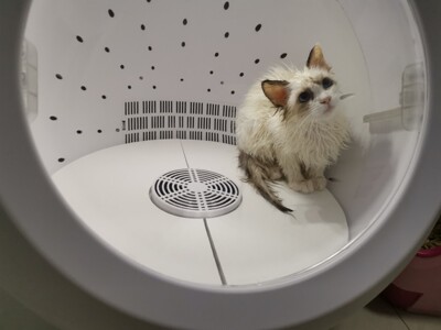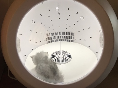 刚给小咪洗完澡甩进去,第一次使用猫咪很害怕,只开了最小档风力它在里面跟疯了一样,咪只有三个月不大,最小的风34度没用到半小时就干了,其实真的很干净,习惯了可能就好了,反正它喜不喜欢我都是满意的