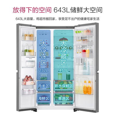 LG敲一敲系列643升冰箱很大,白色,时尚大气。跟现代装修风格很搭,制冷效果好,保鲜也不错。500多升的冰箱容量很大,清洗方便,自动除味,感觉很不错!家里人也说现在京东上买东西又实惠又方便!外形外观 银灰色 非常大气 昨天买的 今天就收到了 非常赞? 而且非常智能、变频的一款保鲜冰箱 容量大小也非常大 很满意 这下可以放很多很多东西了冰箱空间足够大,能满足全家人的需求,妈妈收到很开心。而且京东物流很快,第二天就送到了,太方便了。宝贝和介绍的一样,质感很好,功能强大,用了感觉不错。
