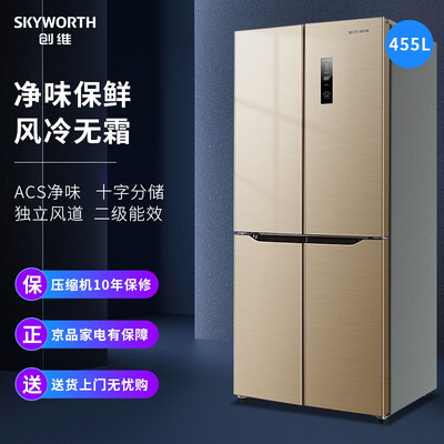 品牌:; 商品名称:创维BCD-455WY; 商品编号:7427648; 商品毛重:92.0kg; 商品产地:中国大陆; 高度:180.1-190cm; 能效等级:二级能效; 压缩机:定频; 类型:常规独立式冰箱; 门款式:十字对开门; 控温方式:电脑控温; 面板颜色:金色; 制冷方式:风冷(无霜); 宽度:75.1-80cm; 总容积:401-500L; 用户优选:京品冰箱,净味; 深度:70.1-75cm; 面板材质:彩钢; 系列:其他; 颜色:星砂金;