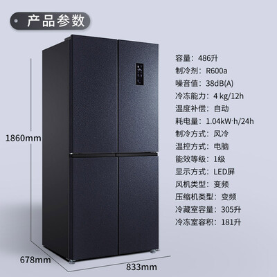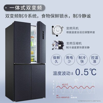 品牌:; 商品名称:TCLBCD-486WPJD星玄青; 商品编号:100011256704; 商品毛重:90.0kg; 商品产地:中国大陆; 系列:TCL 星玄青系列; 压缩机:变频(节能); 类型:常规独立式冰箱; 门款式:十字对开门; 控温方式:电脑控温; 制冷方式:风冷(无霜); 宽度:80.1-85cm; 总容积:401-500L; 高度:180.1-190cm; 用户优选:京品冰箱; 能效等级:一级能效; 深度:65.1-70cm;
