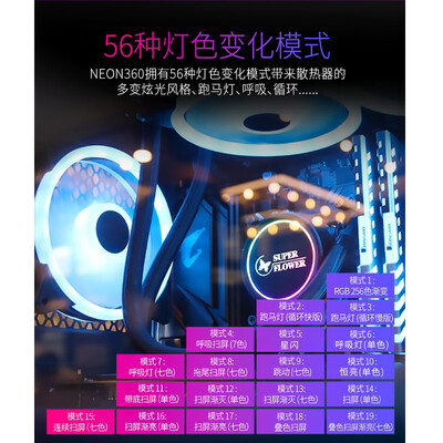 这款360水冷的冷排做工很精致,风扇是。的,还带了控制器,可以主板同步控制灯光颜色,非常的绚丽多彩,散热效果非常好,风扇还是包胶减震的,超级静音!价格京东的618活动力度实在是大,买了很多振华i7F+N240散热效果:还没开机风量风力:还不知道静音效果:还不知道安装方便:难倒是不难外形外观:如果冷头标志可以随意调整方向多好,因为主板是反装的,原本正装标志是正的现在正装标志是倒的产品包装:还好送货很快,今天才顾上装。换上后在BIOS里设置风扇转速为智能,Target Fan Speed为2,风扇转数920多,CPU使用率80%时,CPU温度29度,安静极了。