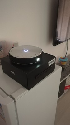 由于忙收货晚了一点现在才来评论下,物品寄过来首先看到包装很好,设有一点损害,拆开上下都垫有海绵这点很好。放在家里原有三角架上正合适,开机很快进入系统亮度足够高,白天播放遮下窗帘很清晰晚上用效果更好。放的音质效果挺好,而且还可以作为恨好的蓝牙音响来放歌。缺点还是有,电源线耍经过出风口位置,线可能老化会快,其它的没什么问题
