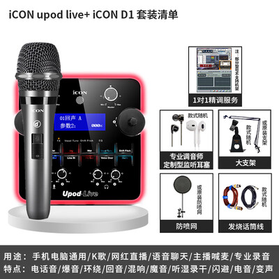 iCON声卡套装upod live用了几天感觉很不错 调音师也特别有耐心一直教我 就算之后再不会还会细心慢慢***何去操作 每个效果都会不错 聊天效果也特别接近原声 ?声卡设计时尚,适合直播,唱出来的歌声特别完美。用了两天朋友特别看好,又帮朋友拍了两套,强力推荐喜欢唱歌直播的朋友们宝贝收到了,个人感觉不错做工质感:手感不错音质音效:声音很清晰,音效很好灵敏度:灵敏度高,收音能力强安装难易:安装很简单,易操作,好上手外形外观:外观看着很有质感,好评