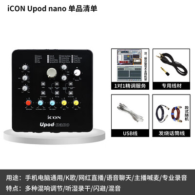 iCON外置声卡 Upod Nao很好用,音质很好,就是做直播挺好用的。刚开始收到安装,调试之类的,有点不会弄的地方,客服也耐心的给我讲解教我。用到现在还是挺好的这款声卡功能很多,基本上直播需要的功能都具备,效果也是非常好的,配件非常齐全,各种线材和支架都齐全,耳麦效果很不错,灵敏度很高,唱歌一点都不费劲东西收到了,晚了几天来评价 就是想使用效果看看怎么样?真的还很不错的质量,质量很好的。儿子天天开心,总是和我抢着玩 一会开一会关的 音质不错?很喜欢款式也不错音响音质也很棒棒棒棒棒棒哒