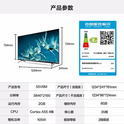 品牌:; 商品名称:TCL55V6M; 商品编号:100021600762; 商品毛重:16.8kg; 商品产地:中国大陆; 货号:553872; 屏幕尺寸:55英寸; 能效等级:二级能效; 分辨率:4k超高清(3840×2160); 推荐观看距离:2.5-3m; 电视类型:全面屏,教育电视,4K超清;