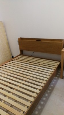 1.3m床放到小卧室里面,大小正好。床头上面可以放手机纸巾盒之类的,还有床头充电的插座很方便。安装师傅也很好,很快就安装好了。 物流速度有点慢,安装倒是很快,不到半小时就安装好了。