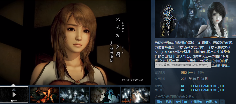 图源vgtime 在任天堂今年6月官宣重制版之前,我们恰好也报道过《零》系列的新闻。距离前作已有7年之后,系列“新作”居然是以机的形式发售,实在让人有些哭笑不得。 不过当《零:濡鸦之巫女》重制版在昨天正式发售后,游戏PC版喜闻乐见在Steam拿到“褒贬不一”的评价,好评率刚过5成。