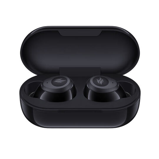 盒子内部的陈列也比较整洁,耳机及收纳盒放置在包装模具中,旁边设计了一个提手便于拿出。其附件均方式在下方暗格内,包括数据线、替换耳帽、使用指南、合格证等,包装内容与大多数国产蓝牙耳机一致。