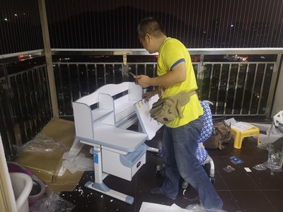 收到书桌的时候外包装看起来就很好,客服还没到就联系了安装师傅,货到家了就给我联系上门来安装了,安装师傅很负责任的,很快就安装好了,还给仔细检查细节呢,安装好之后还叫我怎么调节高度呢,书桌和椅子都是很好呢,可以调节高度的,孩子一天一个样,这个设计真的很好,非常喜欢这书桌,推荐大家来买呢!!!!家里两个小孩,小的还没有读书呢,到时还打算在下单一套呢,非常喜欢的呢,这款椅子也不错,轮滑还可以锁定,大爱双十一下手还是非常优惠的,同时送了台灯和书包。 一共寄了五个包裹,全部收齐后联系客服,客服联系安装师傅上门安装。晚上七点多了师傅过来,装了一个来小时,态度很好(说最近天天忙安装,每天都工作到特别晚),还把桌子和椅子的高度都调到适合孩子身高的高度,我们就不用再动手了。 准备放阳台吹两天再搬进房间。不过,其实刚装好的,真的没什么味道。 性比价非常高的一款学习桌,五星好评。