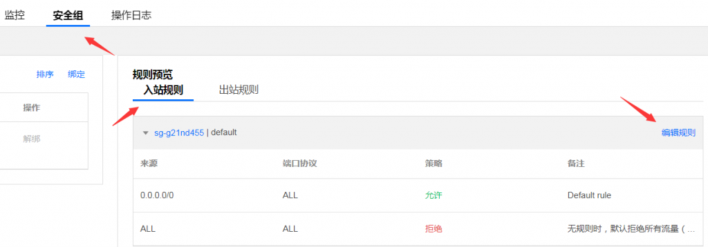 然后选择“安全组”,在默认的“入站规则”右侧点击“编辑规则”。  腾讯云服务器放行端口