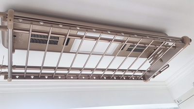 没装过晾衣机很担心安装的问题很难搞,来的安装师傅不爱说话但也很严谨,从开箱到测量尺寸、到安装调试全都做的仔细,厂家也一直在跟师傅电话联系应该是在指导,总之安装很顺利,晾衣机也很好使用,升降安静不吵,速度也不慢,店家还有赠品落地衣架送,感觉赚大了哈哈