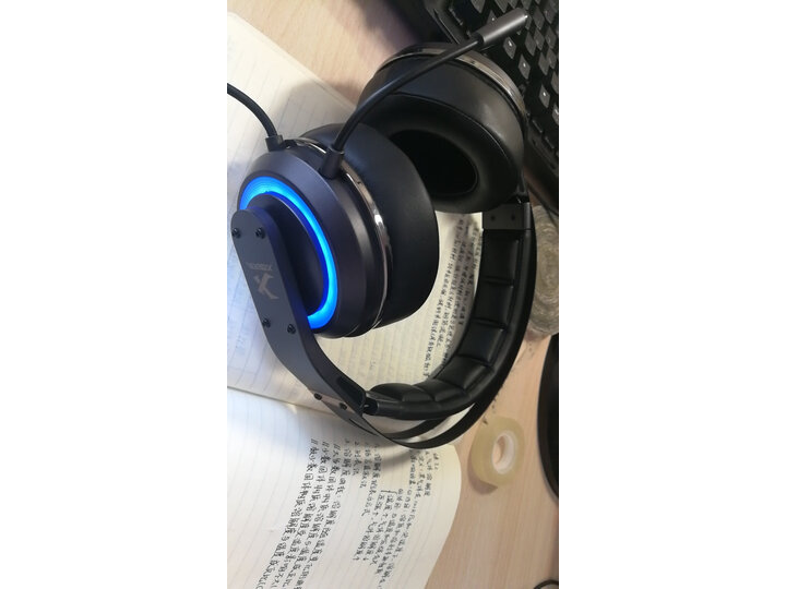 耳机包装很高大上,里面还有个盒子,保修卡说明书啥的还有个logo贴纸,耳机带着很舒服,灯光颜色也很炫酷。