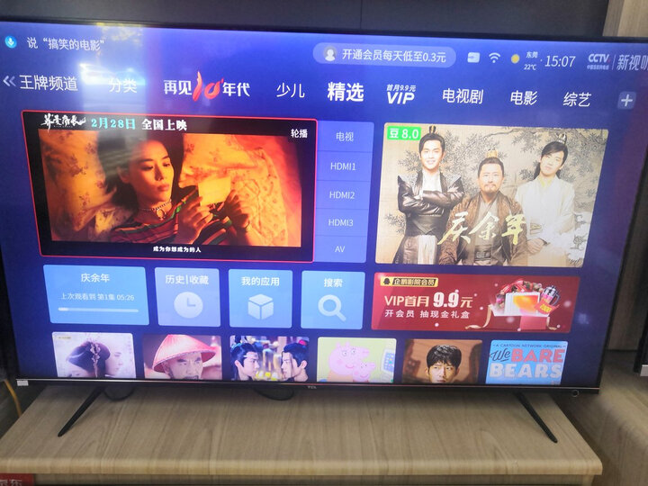 过年期间买的,送货非常及时,电视非常不错,边框很窄,屏占比很大,还可以装应用商店,系统流畅,家人都很满意。这个品牌的电视机我推荐身边的人买了几个了,机器质量信得过,画面质量非常,看起来像无边框一样,挂墙上显得更立体,售后人员态度也很好,当然电视机的价格也很实惠,这个价格买个这么大的电视机真的很实惠了,等过段时间打算买个小点的挂卧室,好品牌好东西值得推荐!送货速度非常快,前一天下午订的单第二天上午下午就来安装了,音效很好画质很清楚 操作起来非常流畅一点都不卡顿外形外观:大大的赞运行速度:还可以,不卡顿屏幕音效:还可以,这个要求没那么高尺寸大小:大小合适功能效果:功能丰富,免费视频资源多外形外观:下边是音响,边上是镶金边。特别上档次!是超薄的。运行速度:速度非常快。没有装机顶盒,也不卡!功能效果:语音控制非常好,不会因为找不到遥控机而看不了电视啦!