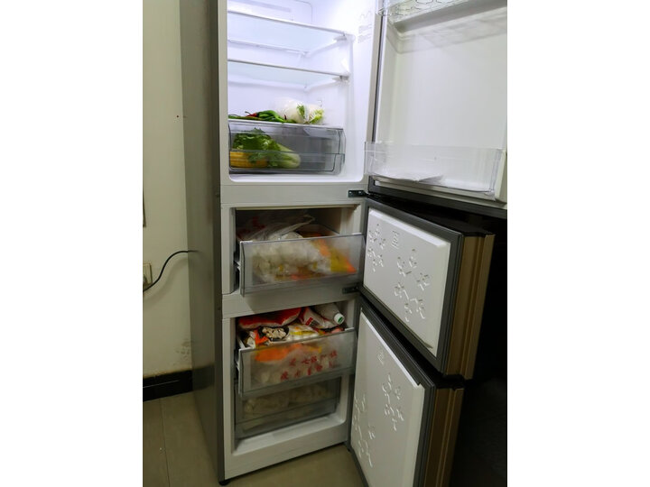 金色外观大气,制冷效果不错,声音也不大,空间家用够了,保鲜效果不不错,下面冷冻有两个抽屉,中间有一个,总体还是够用的