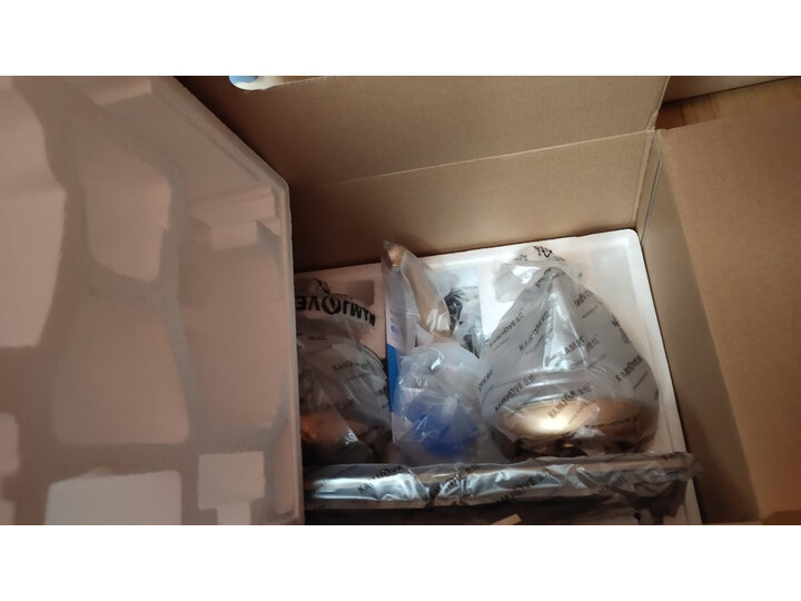 打开外包装,我们可以看到,上部包装为软泡沫衬垫,四角凹槽分别配有4个万向轮,中间部分装有产品说明书配件等。