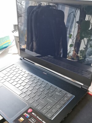 )带去出差了几天,落了一层灰,请忽略。一分钱一分货,整体还是很符合预期的,颜值和性能并存,3A大作无压力。重量还可以,手感也很好,触摸板挺长的,跑分43万跑分,显卡很强,散热也比预期的好,风扇开到最大时的声音也可以接受。屏幕方面个人感觉的确比原来用的60刷新率的好吧,键盘灯光很炫。