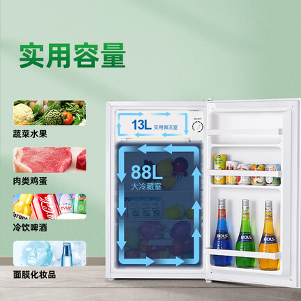 制冷效果:制冷效果挺好的,平常开着3档,冷冻效果不错保鲜效果:饮料放里面特别冰,白菜放一个星期也很新鲜容量大小:侧边有3栏可以放饮料,一栏大概可以放5瓶RIO易拉罐装的,还是可以的。冰冻室可以放大概5包速冻饺子这样子。已经使用3天了,挺好用的。性价比挺高的。经常在京东购物,送货快,质量可以信赖。外形外观:小巧制冷效果:不错真正的租房神器放在公寓合适,一个人方便实用,品牌机器,使用起来方便放心