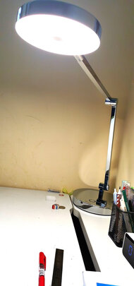 俗话说,生活中不买不需要的东西,必要的东西挑好的买。反复比较,选择了这款德国??柏曼(Paulmann)镜面银A**护眼产品。该款产品第一感觉就是没想到这么沉,非常有质感,放在桌面非常稳定。灯底座可以转动,而且滑动非常自如。它的做工真是一流精致。灯头圆圆的背面就是一个镜面,镜面银名不虚传。该款产品的开关设计十分简洁,就一个按钮,操作起来十分简单,光线柔和,亮度可调,没有频闪,是一个值得拥有的护眼灯具。