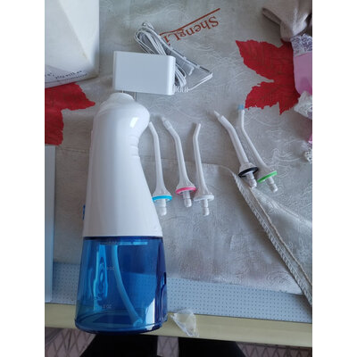 饭后使用,牙隙间确实清洗得很干净。这款洗牙器有三种模式,适合不同的人群使用,如果不是特别顽固的污渍,建议用轻柔就可以了。一套一共5个喷头,可以用很久,器具本身很大支,不滑手,蓝白色很好看,非常喜欢?