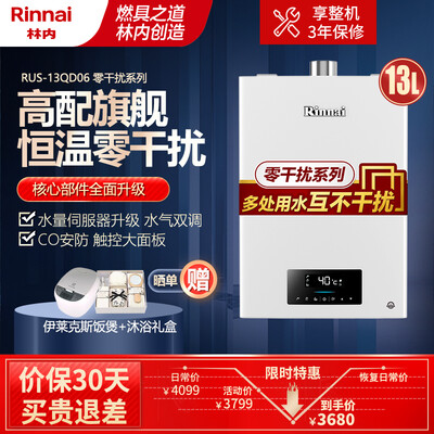 商品名称:林内13QD06<br />商品编号:100007648959<br />商品毛重:16.0kg<br />商品产地:上海<br />货号:RUS-13QD06<br />能效等级:二级能效<br />特色推荐:节能省气,低压启动,水量伺服器,高清大屏,CO预警<br />产品类型:强排式<br />安装费用:安装费300元封顶<br />控温方式:水量伺服器<br />适用户型:一厨两卫<br />气源:天然气(12T)<br />是否防冻:电辅防冻<br />燃热出水量:13L<br />控制方式:触控式<br />