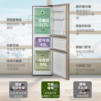 外形外观:很漂亮的白色,我喜欢容量大小:适合小家庭用,可以放很多东西。制冷效果:还没通电。保鲜效果:相信还不错外形美观大方、功能分区很实用、容量也可以、三个空间都可以分别设定、好评好评!外形外观:很漂亮,很大方!容量大小:容量十分满意,感觉能放很多东西。物流小哥很棒非常喜欢这款冰箱,用起来声音很小,制冷非常快,主要外型比较大器。价格也美丽!!!!价格便宜,功能丰富,还是双循环,要啥自行车这个冰箱外观漂亮,里面的空间很大。非常值得拥有