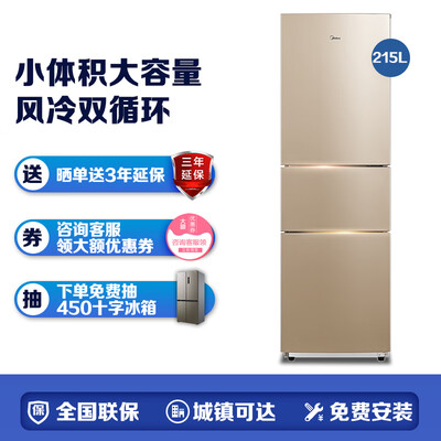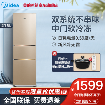 商品名称:美的(Midea)BCD-215WTM(E)<br />商品编号:52201911339<br />商品毛重:56.0kg<br />商品产地:中国大陆<br />货号:BCD-215WTM(E)<br />能效等级:二级能效<br />压缩机:定频<br />特色推荐:精细存储,高颜值,多口之家<br />门款式:三门<br />控温方式:电脑控温<br />产品渠道:线上专供<br />制冷方式:风冷(无霜)<br />宽度:60cm及以下<br />总容积:201-250升<br />高度:170.1-180cm<br />面板颜色:金色<br />系列:其他<br />面板材质:彩钢<br />深度:55.1-60cm<br />