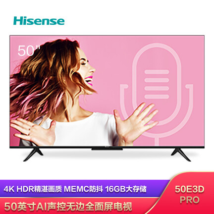 商品名称:海信HZ50E3D-PRO; 商品编号:100007861324; 商品毛重:13.9kg; 商品产地:中国大陆; 屏幕尺寸:48-50英寸; 能效等级:3J能效; 产品渠道:线上专供; 用户优选:新品电视; 电视类型:全面屏,人工智能,教育电视,4K超清; 观看距离:2.5m-3m(46-55英寸); 选购指数:10.0-8.0;