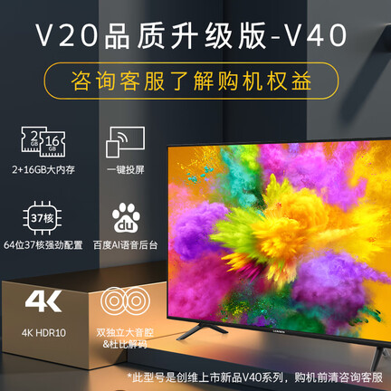 商品名称:创维55V20; 商品编号:100003942012; 商品毛重:14.5kg; 商品产地:中国大陆; 屏幕尺寸:55英寸; 能效等级:3J能效; 电视类型:人工智能,大屏,教育电视,4K超清; 选购指数:10.0-8.0; 观看距离:2.5m-3m(46-55英寸);