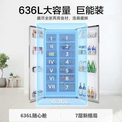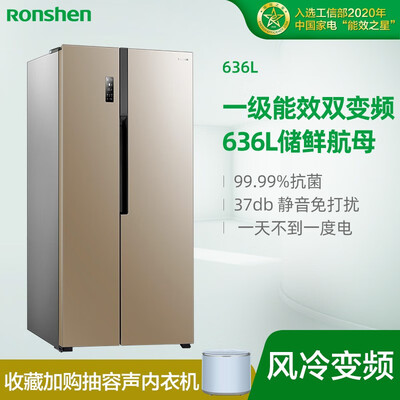 商品名称:容声BCD-636WD11HPA; 商品编号:3801116; 商品毛重:112.0kg; 商品产地:中国大陆; 能效等级:一级能效; 压缩机:变频(节能); 特色推荐:精细存储,多口之家; 高度:170.1-180cm; 门款式:对开门; 控温方式:电脑控温; 产品渠道:线上专供; 制冷方式:风冷(无霜); 宽度:90.1-95cm; 总容积:600升以上; 用户优选:延保服务; 面板颜色:金色; 系列:其他; 面板材质:彩钢; 深度:70.1-75cm;