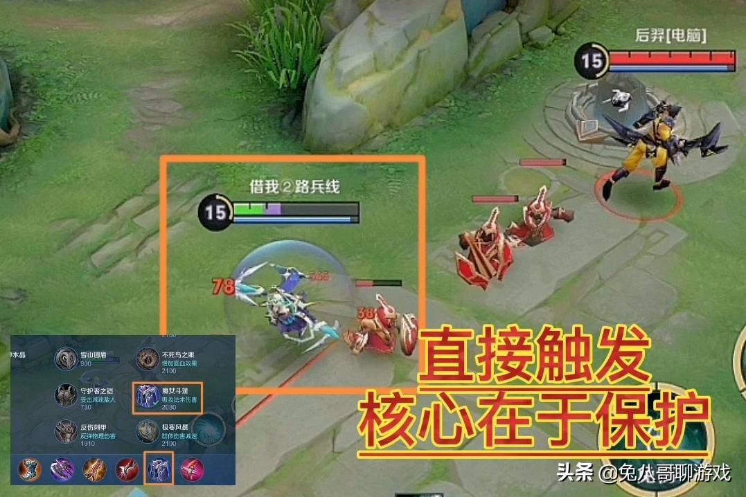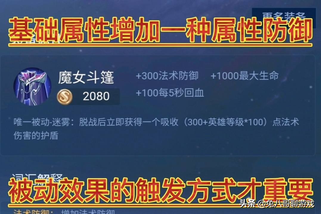 而魔女斗篷这件常用的防御装备就不一样,该装备的防御属性不同,且拥有回血效果,如果以性价比的方式来说这件装备更高。但真正的重要性在于该装备的被动属于一个直接触发的,脱战后立即获得一个吸收(300+英雄等级*100)点法术伤害的护盾。从这一点来说,该装备在自身没有受到攻击时,是一直会存在一个护盾的,而且在队长中,只要承受的伤害没有超过护盾的标准,那么所受到的伤害将会降低。
