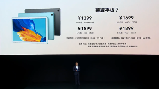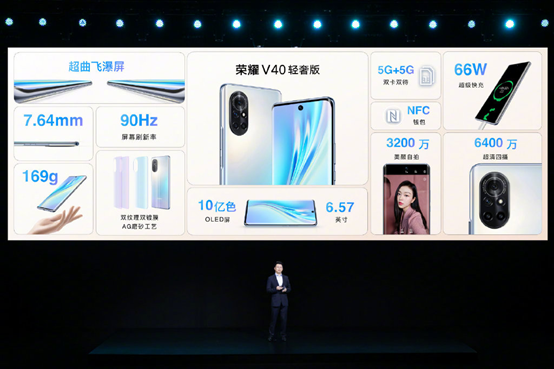 今天下午,荣耀举办了新品发布会,除了荣耀V40轻奢版之外,荣耀还发布了一款荣耀平板7。 荣耀V40轻奢版的前后都采用了双曲面设计,机身厚度仅为7.64mm,重量仅为169g,保证了最 好的握持感,也是目前荣耀最 轻薄的一款5G手机,机身拥有幻夜黑、钛空银河蓝水翡翠三种配色。 正面是一块6.57英寸的OLED曲面屏,分辨率为2340*1080,拥有10亿色彩显示和DCI-P3广色域,支持90Hz屏幕刷新率。前置镜头放在中上方,虽然叫轻奢版,但这块屏幕依旧很优 秀。 前置镜头的像素为3200万,支持人像超级夜景模式,后置为6400万主摄、800万超广角、200万景深和200万微距四摄,支持120°超广角、4CM微距拍摄、独 立人像景深镜头,超级夜景、HDR人像、前后双景录像等多种拍摄玩法。 核心配置方面,荣耀V40轻奢版搭载了联发科天机800U处理器,支持双模5G网络,机身电池为3800mAh,支持最 高66W快充,15分钟即可充至60%,35分钟即可充满,充电速度非常快。 它还支持多功能NFC,能实现门禁卡、交通卡、银行卡、车钥匙等多个功能,实用性很高。 最 后就是售价了,荣耀V40轻奢版的8+128GB为2999元,现在已经开售,而8+256GB为3299元,将在3月26号10:08开售。 而荣耀平板7则定位教育领域,它采用了10.1英寸的显示屏,屏占比达到80%,ppi达到224,拥有锐屏增强算法和莱茵低蓝光护眼认证。核心处理器则是联发科G80,支持智慧分屏、平行视界、畅连通话、教育中心等等功能,它的售价如下: 荣耀平板7的WIFI版将在3月26日10:08正式开售,但LTE版本则还需要等待。 怎么样,这次的荣耀V40轻奢版,你最 喜欢哪个配色?