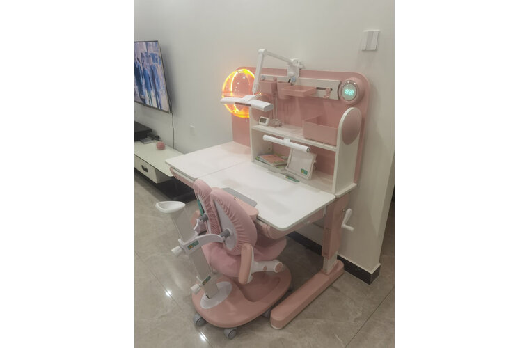 书桌外形美观,使用方便,希望可以帮助孩子养成正确坐姿。这款学习桌总体来说不错,特别特别说一下这个是真材实料,颜色粉粉嫩嫩的,我手机拍出来有点浅其实拍出来正的粉色,写字台比一般的大,有60多公分,写字更宽敞,两边钢结构桌腿,很粗很结实,两边的挂钩可以挂书包,水杯,挺方便的,座椅也很舒服,能支撑孩子的腰部,座的时候能释放腰部的压力,挺满意的,孩子非常喜欢,总之这款学习桌太太好了,?材质质感:看了很久最终选择这款学习桌椅,赶在618下手,颜色小清新,安好后没有异味,款式大气好看,娃娃很喜欢,凳子坐上后下面轮子就是锁死状态,防止滑倒,用到初中没问题。不知道是不是实木,总体来说还是可以。