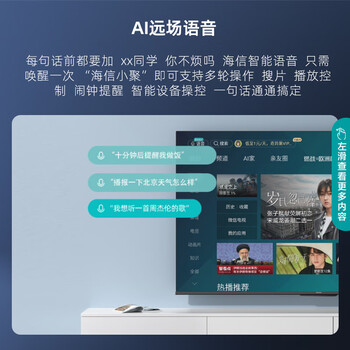 海信这个牌子的产品,质量还是值得信赖的!我买电视都是这个牌子!这款型号,外观漂亮,全面屏,屏幕尺寸大!色彩鲜艳,逼真,音质效果还不错,接口比较丰富,适合接多个设备!带AI语音,选台特别方便,智能,特喜欢!发货速度快,配送速度更快!