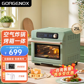 GORGENOXCZ24CG-RMLD烤箱使用测评,分析:GORGENOXCZ24CG-RMLD烤箱测评好不好?一直想换掉家里温度不准的小烤箱,之前去实体店看了**5感觉它的尺寸真的好大,比起来i7还是要稍微mini一点点,方方正正的感觉,绿色也是奶奶的那种,超级可爱。今天到手空烤试了一下,上下管230℃烤了二十分钟,温度也很准的,明天试试烤吃的,希望烘焙小白在烘焙道路上越走越远!我是最帅的仔仔,仔仔对这款烤箱非常满意:1、独一无二的旋转烤架。没时间做烤鸡,但就是觉得很棒,下次一定!2、烤披萨的效果非常好!如图展示某次的成果,口味随心,风格百变,值得拥有!3、烤箱内部如图,小家庭日常使用很合适,足够宽敞。4、铝合金烤盘,不锈钢旋转烤架,既实用又耐用。