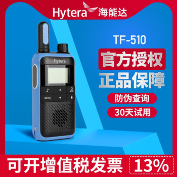 海能达TF510使用测评,海能达TF510对讲机入手测评外形外观:外形外观:整机 外形尺寸小巧,儿童手拿着不累,大小刚刚好。通话效果:效果很清晰,17楼层和地面通话正常,无杂音。续航能力:拥有省电模式,功率很小,对儿童很适合。其他特色:单独的蓝色发射按钮方便儿童使用,比侧面发射按键更容易使用。清晰,辐射应该是低的,我们国家信号这么好,两辆车出行时用这种对讲机足够了。最远试过相隔二十多公里对讲。如果**20多公里对讲的话辐射得多大啊?轻度使用,下车关机,有一台机五天都不用充电,另一台机第三天晚上忘记关机了没电了要重新充。省电可能也是因为声音开得较小吧,但是清晰就不用开那种大声。