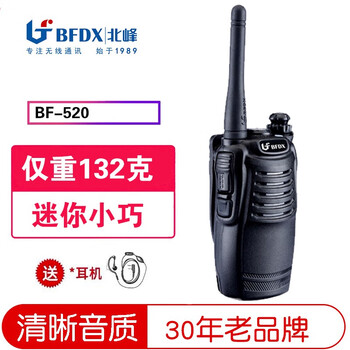大家评:北峰BF-520对讲机参数,好不好?外形外观:东西比我想象中的还要完美,十分给力,值得入手通话效果:整体来说,还是很好的,非常值得再次回购续航能力:款式很大方,质量非常好,价钱也很合理细节非常完美,整体来说真的很不错。性价比很高,下次还会继续光顾!外形外观:标准对讲机外观,小巧玲珑。通话效果:通话时没有杂音,通话时有指示灯显示。续航能力:待机一天没问题,重度使用大半天,可以用USB线充电,带2个坐充。电池也可以拆下来单独插在座充里面。使用环境:空旷地带3公里,市内1公里左右。防护等级:不防水。其他特色:小巧,性价比高,可以USB充电。