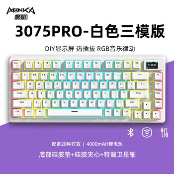 大家觉得魔咖monka3075键盘测评怎么样?魔咖monka3075口碑如何?京东物流真快,疫情之下,隔天就能到。键盘坏了,刚好看中这款,毫无犹豫的下单。入手包装就很惊艳,连接电脑插上就可以使用。右上角的指示灯也很清晰明了。按键手感也不错,灯光更不用夸了,很酷,价位也很适中。总体这款键盘很不错。相信京东自营。最近给fufu配电脑,选择了这个键盘,显示屏买了两次,都收到了二手的,ptsd了,目前只能用手机测试了一下,委屈我的fufu了(つд⊂)个人不是很喜欢光污染,不评价。机械键盘就使用过樱桃红轴,没有用过银轴。新的这一款触感不错,声音确实很集中,甚至有一点点像陶瓷了。具体怎么选还是看人。包装盒很新,包装比预期好很多,实物比图片好看。