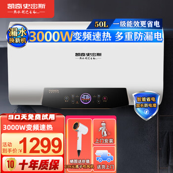 达人解读凯奇史密斯DSZF-B50T入手测评,怎么样?安装人员到了说要看一下安装环境,下楼的时候说建议用ppr管,我说不用了,用原来就有的304波纹管就行了,后面态度就变了,去车上拿工具叫我帮给他拿三楼去,这次帮他拿一包工具包上去了,看了他自己只拿一件打孔冲击钻,安装的时候使坏,用螺丝刀在止回阀里面撬一下,后面生料带随便乱缠就安装止回阀上去,安装好了他人走了,不放心拆了止回阀查看一下生料带只进去止回阀一丝,没有橡胶垫不知道是原来就没有还是被他弄掉了,打好孔了又叫我给他拿电热水器,他自己站着不动,我说是你安装还是我安装,后面他自己去拿了装上去,刚挂上去我就说不想安装这样就行了,后面我自己安装,后面说几次没水进去,我按了一下旁边小便池的水龙头有水出来,后面又说了一次没水,这个时候我不会走开,一走开可能会使坏什么的。上次买了一个40升的也是的,打电话问我需不需要安装,我看了孔位一样的自己挂上了就可以了,就没有叫他们过来安装。过了好久看热水器灯好在亮着,看了有高温抑菌转了一点点灯就灭了,看了说明书也没有说要不要开到高温抑菌哪里。百搭的浅灰与卫生间的墙面和谐融洽,整体很漂亮。我选的这一款是3300w的双胆速热,相同容量的水加热到相同温度、用电相同、时间更短。安装完试了一下,加热速度真的快。一级能耗、85%的热水输出率、24小时保持恒定温度1.02度电。冲澡的话足够四人用。最重要的是安全方面,最新防电墙优于其他,可以边用水边加热,这是非常方便的!