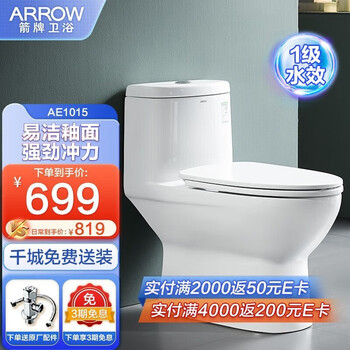求大家普及下ARROWAE1015马桶参数,口碑如何?之前对恒洁卫浴的产品一直都有关注,原来家里就买过。这次装修新房,自然还是首选的恒洁卫浴。两个卫生间,趁着618优惠活动选择了套餐,两个马桶一个花洒。收到货后很满意,瓷体细腻洁白如玉,款式新颖,设计合理。安装师傅也很认真,效果完美。客服服务很好,特意安排师傅提前上门测量坑距和水路,确认完尺寸再发货,非常负责避免了换货的麻烦,收到货马上给我安排了安装师傅,师傅上门安装及时且专业。现在马桶用着冲力很不错,陶瓷釉面摸着很光滑,质量很好,很灵敏,使用起来感觉很高级。