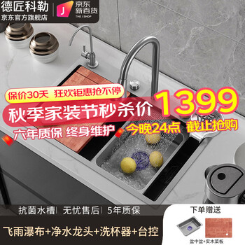 大家评:德匠科勒KC01水槽测评好不好?怎么样?这款洗菜盆,性价比还是比较突出的,整个的厚度比一般的盆要厚,比较有分量,做工也还中规中矩。但是他有一个问题就是,水龙头附近的材料,并不是特别好。用了几天发现下面还是有锈迹,不知道这个锈迹是从何而来,总之多少会有一些失望。家里准备装修,一直很想要很大的洗碗槽,一开始考虑买单盆,但是感觉会很浪费水,所以看中了这款双盆的水槽,刚好赶上五一活动优惠,赶紧下手,昨天买今天就收到货了,材质是304不锈钢的、非常重!质量真的很好,非常满意的购物,也许厨房天天要看的自己开心喜欢才最重要吧。