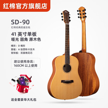 揭秘红棉SD-90评价如何?入手测评声音音质:音质清晰,声音很柔和,拨动手感很好!实物颜色:表面颜色采用纯木色,边缘采用暗红色,更显沉稳。尺寸大小:买的是41寸的,对于175的我来说正合适!做工细节做工很好,手感很亲和,表面光滑!材质手感:材质看起来纹路清晰,重量适中!其他配置的配件很齐全,还包括了学习材料!总体来说物超所值!!京东送货很快,收到吉他后发现弦钮齿轮松了,扭不紧,联系客服后客服说给我补发弦钮,服务态度很好。实物颜色:亮黑色的看着漂亮尺寸大小:尺寸大小合适,入门挺不错的做工细节:做工质量不错,做工好没有裂缝材质手感:材质挺不错,拿着有手感,价格实惠,值得入手!