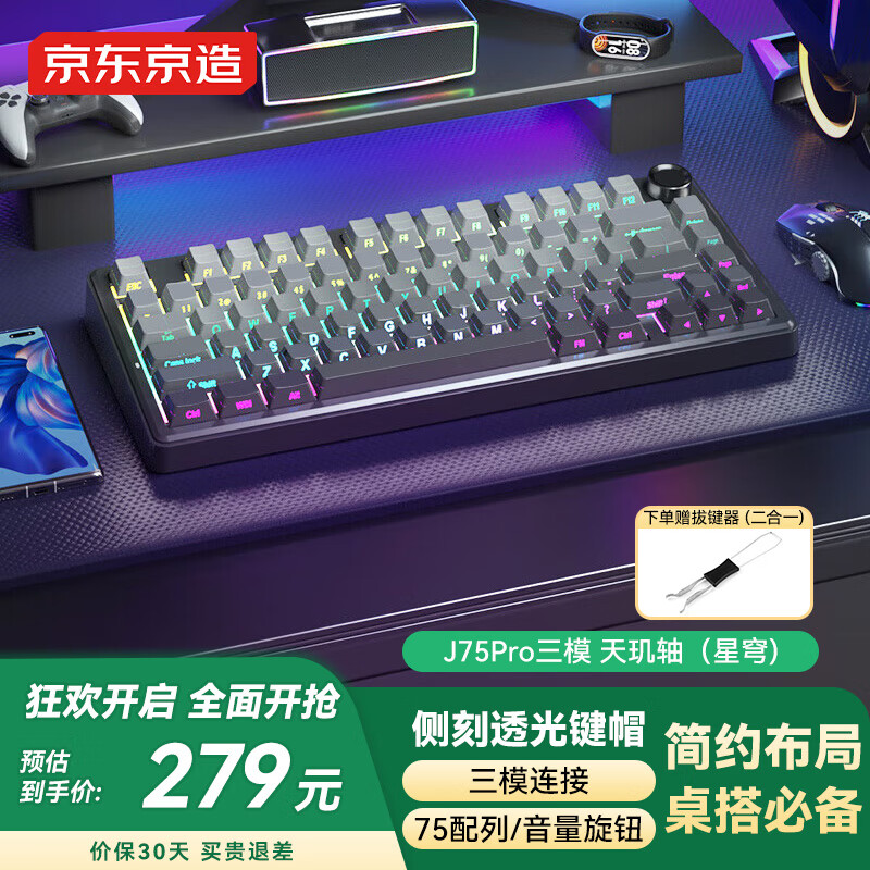 大家评测揭秘京东京造J75Pro机械键盘口碑如何?好不好?我自我感觉这个轴体是麻将音的,我个人很喜欢响应速度 三模不管哪个模式,我都试了一下,响应速度这个真的不用担心,相信厂家对于这款产品的调教吧产品材质 重量还是有一点的,但毕竟真材实料嘛,键帽防油防手汗,整体背光效果出众给宝贝女友买的,外观没得说,配色很清新配上紫色背光灯更绝。手感方面敲击力度适中,触发灵敏,而且声音太棒了用来办公一点也不吵,键帽材质不易脏污,键帽高度打字也合适并且两档调节高度可调,因为放办公室用就用了有线模式,后面在尝试其他链接方式,总之,买!!!