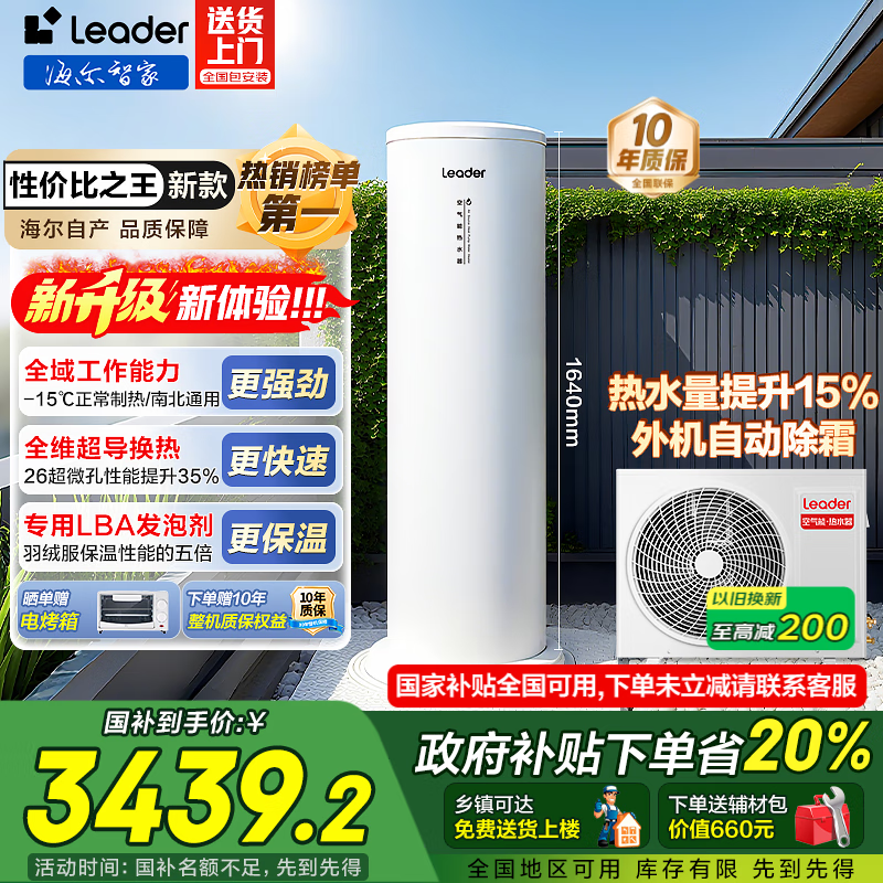 选了海尔空气能热水器300L的,够大,看起来很高档,放楼顶不占地方,4层楼都不怕没热水用,师傅很专业服务好安装非常及时,因为着急用,没想到大晚上11点多也来安装,幸苦了,给师傅大大的赞外形外观:高档简洁时尚。加热速度:加热速度快